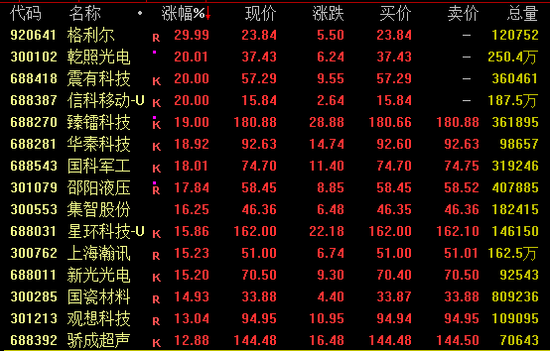 全A超3900股飘红,逾110股涨停。AI应用概念爆发,易点天下、昆仑万维20%涨停,星环科技创历史新高;商业航天概念热度不减,中国卫通尾盘涨停创出新高,臻镭科技、理工导航、航天电子等均创新高;有色板块强势,云南锗业、厦门钨业等涨停;创新药概念拉升,前沿生物、泓博医药等涨停。值得注意的是,锋龙股份(002931)斩获11连板,鲁信创投11日收获9板,志特新材(300986)连续5日20%涨停。